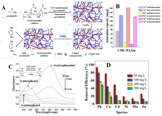| CMC/PAAm semi-IPN hydrogel | Cu(II) Pb(II) Cd(II) | 227.3 312.5 256.4 | Batch; Monocomponent/Mixture; Parameters: pH 5.5, 24 h, 298K, dose 0.5 g/L; Fitting: Langmuir/PSO; Reusability: 90.9% (3 cycles); Application in catalytic reduction of 4-nitrophenol. | [79] |