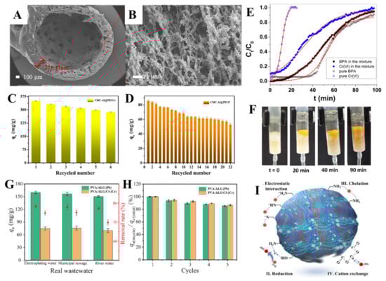 | NaLS/PEI/ALG beads | Cr(VI) | 2500 | Batch/Column; Monocomponent/Mixture; Parameters: pH 2, 6 h, 298 K; Fitting: Langmuir/PSO; Selectivity: minimum influence from humic acids and coexisting anions; Applied in secondary electroplating wastewater treatment in columns. | [125] |