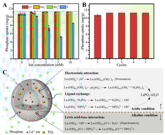 | PVA/ALG/palygorskite beads | H2PO4− | 33.2 | Batch; Monocomponent/Mixture; Parameters: pH 4, 6 h, 313 K; Fitting: Freundlich/PSO; Selectivity in the presence of co-existing anions (Cl−, NO3−, SO42−F−); Reusability: 100% (5 cycles). | [165] |