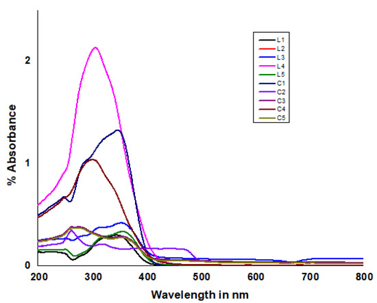 The 1H-NMR spectra of all the synthesized Schiff base ligands were recorded in DMSO solvent and expressed in ppm. The 1H-NMR spectra of the synthesized compounds exhibit signals due to aromatic protons as a multiplet at 6.49–8.23 ppm. In the 1H-NMR spectrum of the Schiff base ligands, a singlet observed downfield around 12.56–12.92 ppm, integrating for one proton, is assigned to –OH [39]. Similarly, the azomethine proton (attached to the carbon close to the nitrogen atom) appears around 8.68–8.80 ppm as a singlet signal [40]. Representative proton 1H-NMR spectra of L1, L2, L3, and L5 are shown in Figures S10–S13. The proton and carbon NMR of complexes are depicted in Figures S25–S30.