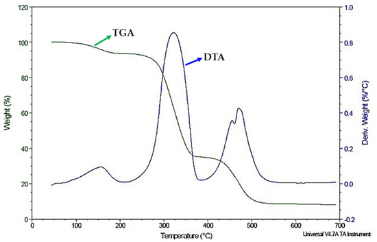 The loss of water molecules was observed below 150 °C, which is due to the presence of lattice water molecules [41,42]. This further tells us that the coordinated water molecules occupy some position in the coordination sphere of the central metal ion. These water molecules are more strongly bonded to the metal ions thus eliminated at the higher temperatures. A further rise in the temperature, leading to the loss of mass in a slow gradual manner, was observed, which may be caused due to decomposition of metal complexes by the fragmentation and thermal degradation of organic parts and at the end, the metal oxide was formed as residue [43]. The thermal data are provided in Table 4 and representative thermal graphs of Co(II) complex (C1) is shown in Figure 3.