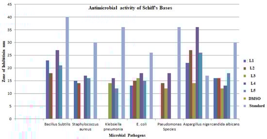 Graphical representation of antibacterial and antifungal activities of Schiff bases against bacterial and fungal pathogens.