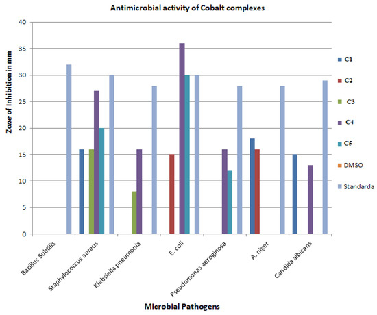 On the other hand, it was observed from these results that the Co(II) complexes were less effective against both Gram-positive and Gram-negative. Moreover, only a few complexes show antifungal activity. There was no zone of inhibition shown by any cobalt complex against Bacillus subtilis. Out of five cobalt metal complexes, only C4 showed antibacterial activity against both Gram-positive, Gram-negative, and fungal pathogens (Figure 5).
