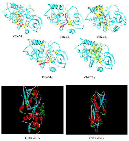 Binding interaction of Schiff base ligands (L1-L5) (top) and Co(II) complexes (C1–C2) with CDK-7 protein (bottom).
