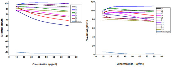 All the synthesized compounds were screened for their anticancer activity against human breast cancer cell line MCF-7 and human lung cancer cell line A-549. The growth curves of human breast cancer cell line MCF-7 and human lung cancer cell line A-549 of Schiff bases (L1–L5) and their Co(II) complexes (C1–C5) are represented in Figure 7. The anticancer activity was measured in vitro for the newly synthesized compounds against breast cancer cell line MCF-7and human lung cancer cell line A-549 using the Sulforhodamine B stain (SRB) assay method [43]. The average values for % control growth for the cell line MCF-7 and human lung cancer cell line A-549 are listed in Table 9 and Table 10.