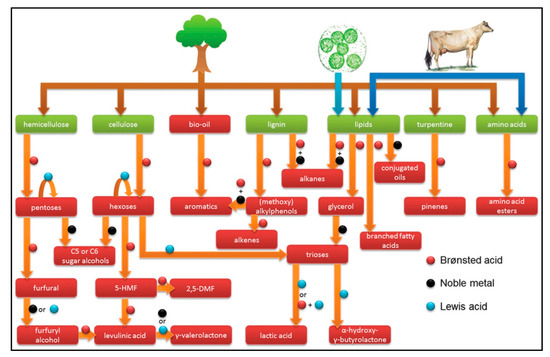 - Dusselier, M.; Mascal, M.; Sels, B.F. Top Chemical Opportunities from Carbohydrate Biomass: A Chemist’s View of the Biorefinery. In Selective Catalysis for Renewable Feedstocks and Chemicals; Topics in Current Chemistry; Springer: Cham, Switzerland, 2014; Volume 353, pp. 1–40. [Google Scholar] [CrossRef]