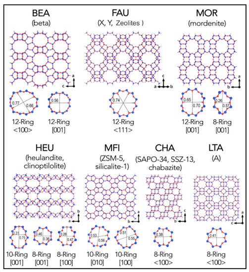 Shows the selected zeolite structures framework assigned with a three-letter code by the International Zeolite Association. Zeolites are classified based on their widest pore windows: small-pore (≤8-ring), medium-pore (10-ring), large-pore (12-ring), and extra-large-pore zeolites (>12-ring) [66].