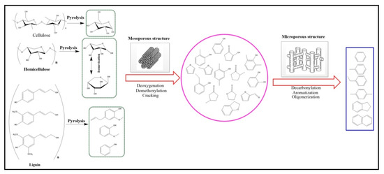 Reaction schematic of biomass-derived feedstocks with ZSM-5 catalyst (Zhang et al., 2011, The Royal Society of Chemistry) [116].