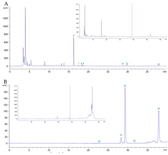 Chromatogram of S. androgynus leaves at λ = 272 nm, flow rate 0.9 mL/min, for 65 min. (A), methanolic extract (20 × dilution); (B), hexanoic extract (20 × dilution). Peak 1, ascorbic acid; 2, gallic acid; 3, catechin; 4, caffeic acid; 5, syringic acid; 6, rutin; 7, p-coumaric acid; 8, sinapic acid; 9, ferulic acid; 10, myricetin; 11, quercetin; 12, apigenin; 13, kaempferol; 14, eugenol.