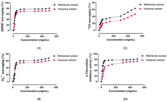 Effect of methanolic and hexanoic extracts of S. androgynus leaves against (A), DPPH•: 1,1-diphenyl-2-picrylhydrazyl; (B), O2•−: superoxide; (C), •NO: nitric oxide; (D), α-glucosidase.