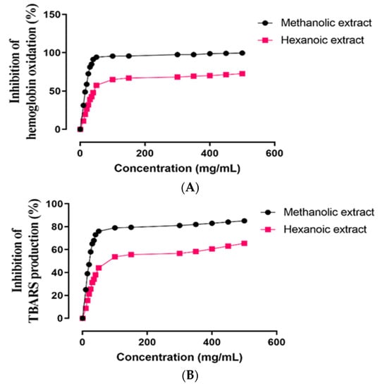 Antioxidant activity of two methanolic and hexanoic plant extracts were determined in a concentration-dependent manner in the scavenging system of the radicals DPPH•, •NO, and O2•− (Figure 2A–C, respectively). The IC50 values of those plant extracts are summarized in Table 3. Compared to hexanoic plant extracts, methanolic plant extracts shown a greater capacity to scavenge DPPH•, •NO, and O2•− (p < 0.05).