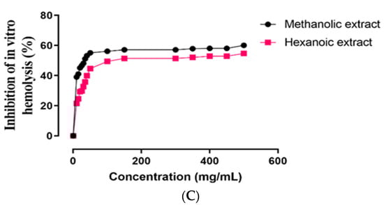 Effect of methanolic and hexanoic extracts of S. androgynus leaves against (A) hemoglobin oxidation; (B) lipid peroxidation; (C) hemolysis.