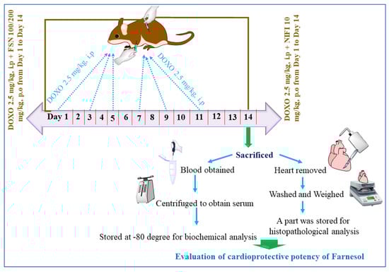 - Group V (Standard): nifedipine 10 mg/kg, p.o. Daily for 14 days + DOXO, similar to Group II. The graphical presentation of the treatment protocol is shown in Figure 1 [15,17].