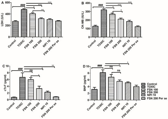 Showing the effect of FSN on DOXO-induced altered cardiac injury markers, lactate dehydrogenase (LDH) (A), creatine kinase-MB (CK-MB) (B), cardiac Troponin-T (cTn-T) (C) and B-type natriuretic peptide (BNP) (D). ### p < 0.001 significant versus control; * p < 0.05, ** p < 0.01, *** p < 0.001 significant versus TOXIC and ns is non-significant versus TOXIC.