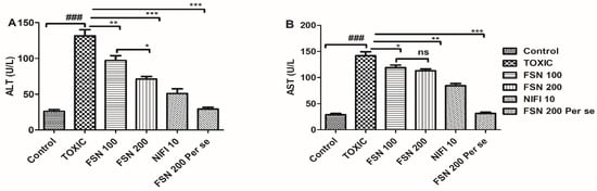Showing the effect of FSN on DOXO-induced altered non-specific cardiac injury markers, aspartate aminotransferase (AST) (A), and ala-nine transaminase (ALT) (B). ### p < 0.001 significant versus control; * p < 0.05, ** p < 0.01, *** p < 0.001 significant versus TOXIC and ns is non-significant versus TOXIC.