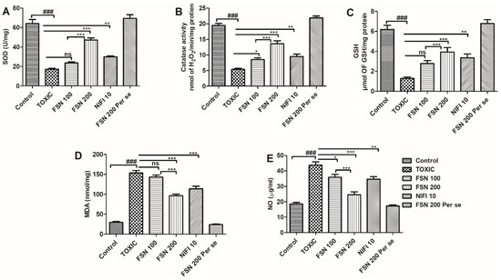 Showing the effect of FSN on DOXO-induced oxidative and nitrative stress enzymes superoxide dismutase (SOD) (A), Catalase (B), glutathione (GSH) (C), malondialdehyde (MDA) (D) and nitric oxide (NO) (E). ### p < 0.001 significant versus control; * p < 0.05, ** p < 0.01, *** p < 0.001 significant versus TOXIC, and ns is non-significant versus TOXIC.