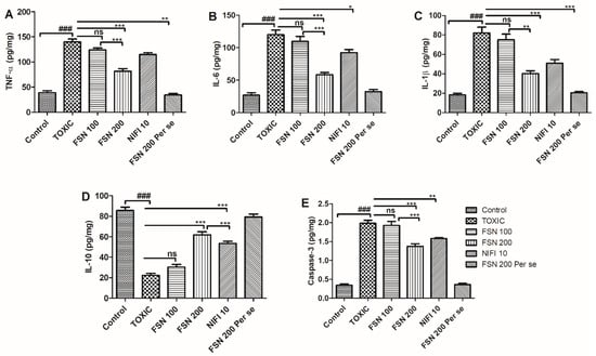 Showing the effect of FSN on DOXO-induced elevation of proinflammatory cytokines TNF-α (A), IL-6 (B), IL-1β (C), decrease in cytokines IL-10 (D) and increase in apoptotic marker Caspase-3 (E). ### p < 0.001 significant versus control; * p < 0.05, ** p < 0.01, *** p < 0.001 significant versus TOXIC, and ns is non-significant versus TOXIC.