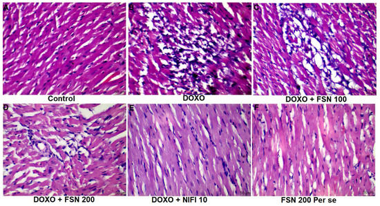 (A–F), showing the effect of FSN on DOXO-induced histopathological abrasions in the cardiac tissue. DOXO treated group showed marked histopathological damage such as cellular disintegration, vacuolation, pyknosis and myofibrillar damage. Treated with FSN 200 and NIFI 10 significantly reduced the histomorphological damage whereas FSN 100 was found to be ineffective [scale bar 50 µm]. FSN 200 per se showed similar histopathological attributes as those exhibited by the control group. Hence, the safety of FSN 200 was also validated.