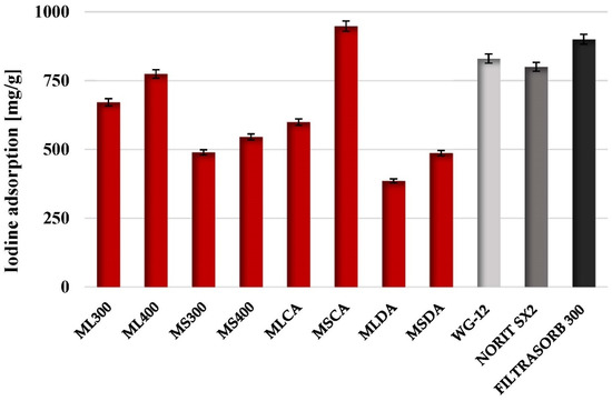 2.2. Adsorption Properties of the Prepared Biochars and Activated Biocarbons