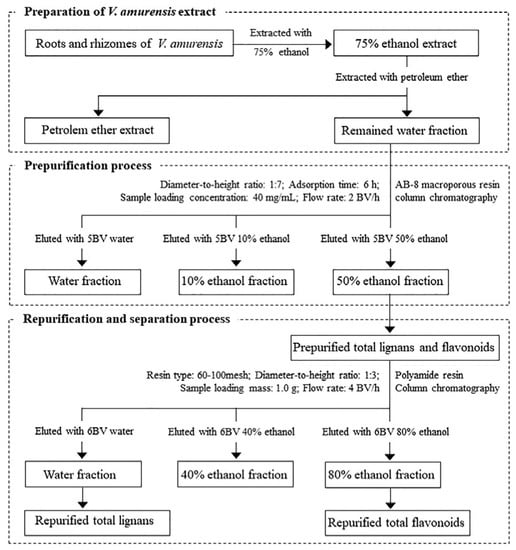 Zhang, M.; Yang, B.; Ye, M.; Chen, J.; Liu, Y.; Wang, C. An Effective Chromatography Process for Simultaneous Purification and Separation of Total Lignans and Flavonoids from Valeriana amurensis. Molecules 2022, 27, 8598. https://doi.org/10.3390/molecules27238598