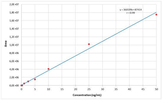 The developed method was validated according to the recommendations of the Scientific Working Group of Forensic Toxicology (SWGTOX) [48]. The selectivity, specificity, calibration model, limit of quantification, precision, BIAS, carryover, matrix effect, stability, and dilution integrity were assessed. Validation was performed using rapeseed oil as a blank matrix.