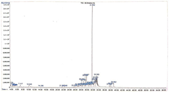 A total of 5 µL of ethanolic extract from a Tacca tuber was injected into the GC-MS instrument (Agilents Technologies 7890GC/5975MS) using an HP Ultra 2 capillary column with a length of 30 m, inner diameter of 0.20 mm and film thickness of 0.11 µm, and helium as the carrier gas with a constant column flow of 1.2 mL/min and split ratio of 8:1. The oven temperature was initially set to a temperature of 80 °C (held for 0 min), then increased at 3 °C/min to 150 °C (held for 1 min) and then finally increased at 20 °C/min to 280 °C (held for 26 min). The injection site temperature was 250 °C, the ion source temperature was 230 °C and the interface temperature was 280 °C. The eluted component was detected on the mass detector. The mass spectrum fragmentation pattern was compared with that stored in the spectrometer database, which uses the W8N08 Mass Spectral library. The percentage of each component was calculated from the relative peak area of each component in the chromatogram [53].