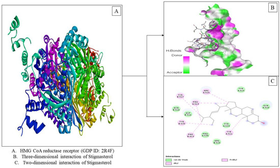 Visualization of the HMG-CoA reductase receptor docking (PDB ID: 2R4F) with stigmasterol.