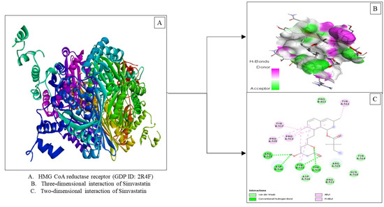 The initial stage of this research was carried out by downloading the molecular structure of the HMG-CoA reductase receptor in 3D format (.pdb) which was obtained from the Protein Data Bank, specifically the website www.rcsb.org, accessed on 3 January 2022. The molecular structure of the HMG-CoA reductase receptor used in this study is PDB ID: 2R4F [44].