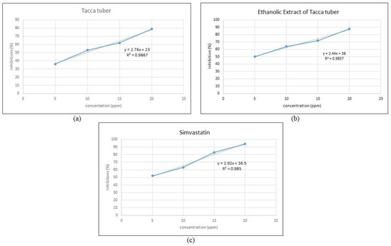 HMG-CoA reductase inhibitory activity was analyzed using the HMG-CoA reductase (HMGCR) enzymatic assay kit (Sigma Aldrich, Catalog No. CS1090). The kit consists of an assay buffer, NADPH, HMG-CoA as the substrate solution, HMG-CoA reductase (HMGCR) as the catalytic domain (0.5–0.7 mg/mL) and pravastatin as an inhibitor solution. The inhibitory activity of the ethanolic extract on HMG-CoA reductase (HMGCR) activity is monitored by comparing it to pravastatin (kit inhibitor) and simvastatin (commercial inhibitor), which serve as references. The Tacca tuber, ethanolic extract and simvastatin were tested at four concentrations: 5, 10, 15 and 20 ppm. The assay reaction was prepared by mixing 1× assay buffer, pravastatin, NADPH, HMG-CoA and HMGCR, according to the procedure of the assay kit. The activity of the HMG-CoA enzyme was measured immediately with a Micro-plate/ELISA Reader UV/Vis spectrophotometer every 10 s for 10 min at 37 °C and λ = 340 nm. Enzyme activity is expressed in units/mg of protein and calculated by Equation (1).