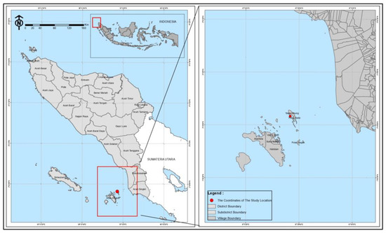 The plant materials, namely Tacca tubers (T. leontopetaloides), were collected from Teluk Nibung village, Ujung Batu Island, Banyak Islands, Aceh Singkil, Aceh Province. The sampling location was 2°20′54″ N 97°23′08″ E (Figure 6). The materials used in this study were distilled water, ethanol 96%, Dragendorff reagent, Wagner reagent, Meyer reagent, FeCl3 (Merck & Co, Rahway, NJ, USA), magnesium powder, HCl (Merck), chloroform (Merck), anhydrous acetic acid, H2SO4 (Merck), Folin–Ciocalteau reagent (Merck), Na2CO3 (Merck), NaNO2 (Merck), AlCl3 (Merck) and NaOH (Merck). The 3D structure of the HMG-CoA reductase enzyme (PDB ID: 2R4F) and the 3D structure of the ligand were downloaded from the Protein Data Bank (PDB).