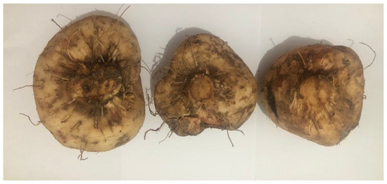 Samples of the Tacca plant (T. leontopetaloides) were determinations in the Department of Biology, Faculty of Mathematics and Natural Sciences, University of Syiah Kuala (USK) Banda Aceh. The samples in this study were Tacca tubers with weights of ±300 g (Figure 7). Samples of Tacca tubers were peeled and cut into pieces before the extraction process. Then the samples were dried using an oven at a temperature of 35–40 °C. The extraction process was carried out by the maceration method 3 × 24 h using ethanol 96%, with a ratio of 1:10. The samples in the form of mashed Tacca tubers (simplicia) were put into maceration bottles (macerator). Solvent was then added until all the ingredients were submerged and allowed to stand for 3 days in a place protected from sunlight while stirring occasionally. After 3 days, filtering was carried out using filter paper so that the macerated sample and pulp were obtained, which were then re-maceration twice. The resulting macerated sample was then concentrated using a Rotary Evaporator (Buchi Rotavapor® R-300, Flawil, Switzerland) to produce a concentrated extract [50].