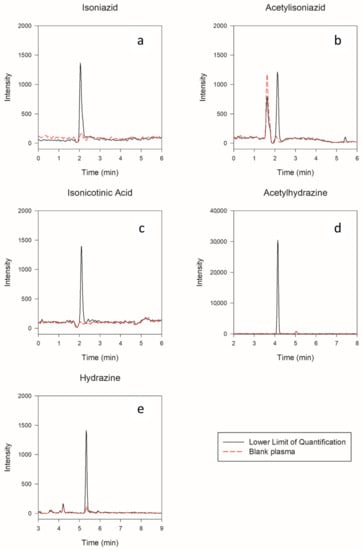 Chromatogram of all analytes in LLOQ compared to blank plasma. There were no significant interferences at the time of the analyte’s elusion in blank plasma, indicating the method is specific for each analyte: (a) isoniazid LLOQ compared to blank plasma; (b) acetylisoniazid LLOQ compared to blank plasma; (c) isonicotinic acid LLOQ compared to blank plasma; (d) acetylhydrazine LLOQ compared to blank plasma; (e) hydrazine LLOQ compared to blank plasma.
