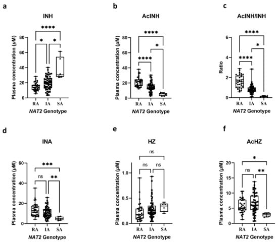 Concentrations, ratio of isoniazid and four metabolites in tuberculosis (TB) patients’ plasma at 2 h after drug administration according to N-acetyltransferase-2 (NAT2) phenotypes: (a) isoniazid 2 h postdose plasma concentration in TB patients according to NAT2 phenotypes; (b) acetylisoniazid 2 h postdose plasma concentration in TB patients according to NAT2 phenotypes; (c) acetylisoniazid/isoniazid 2 h postdose plasma ratio in TB patients according to NAT2 phenotypes; (d) isonicotinic acid 2 h postdose plasma concentration in TB patients according to NAT2 phenotypes; (e) hydrazine 2 h postdose plasma concentration in TB patients according to NAT2 phenotypes; (f) acetylhydrazine 2 h postdose plasma concentration in TB patients according to NAT2 phenotypes. Abbreviations: INH, isoniazid; AcINH, acetylisoniazid; INA, isonicotinic acid; HZ, hydrazine; AcHZ, acetylhydrazine; NAT2, N-acetyltransferase-2; RA, rapid acetylator; IA, intermediate acetylator; SA, slow acetylator; ns, p > 0.05; *, p ≤ 0.05; **, p ≤ 0.01; ***, p ≤ 0.001, ****, p ≤ 0.0001.