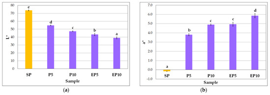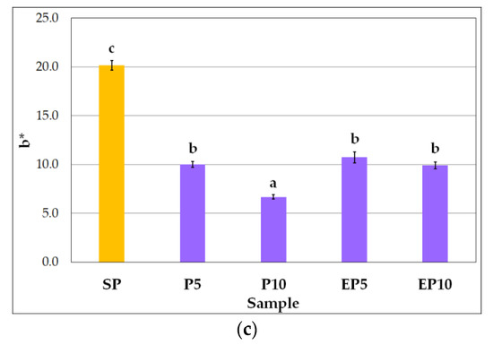 Color parameters of pasta samples: (a) L*; (b) a*; (c) b*. Explanations: SP—semolina-only pasta; P5—pasta with 5% substitution of semolina with non-extruded blackcurrant pomace powder; P10—pasta with 10% substitution of semolina with non-extruded blackcurrant pomace powder; EP5—pasta with 5% substitution of semolina with extruded blackcurrant pomace powder; EP10—pasta with 10% substitution of semolina with extruded blackcurrant pomace powder. Mean values marked with different letters (a–e) are significantly different at significance level of 0.05.