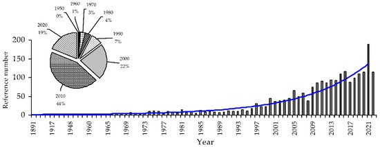 Distribution of studies on plant species from the Calendula genus by year (1891–2022) and an exponential ‘curve of interest’ (blue line). The X-axis is the year, and the Y-axis is the number of publications. The inset shows the impact of each decade on the total publication value.
