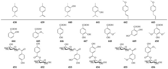 Six simple phenols (i.e., p-cymene (438), p-cymenene (439), carvacrol (440), thymol (441), p-anethole (442), and estragole (443)) are the minor constituents of the essential oil of C. officinalis [30,35,36] and C. arvensis [16] (Figure 5).