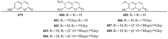Coumarins 479–488. βDGlcp—β-D-glucopyranose; αLRhap—α-L-rhamnopyranose.