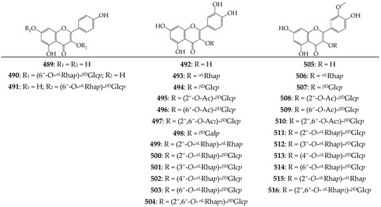 Flavonoids 489–516. Ac—acetyl; βDGalp—β-D-galactopyranose; βDGlcp—β-D-glucopyranose; αLRhap—α-L-rhamnopyranose.