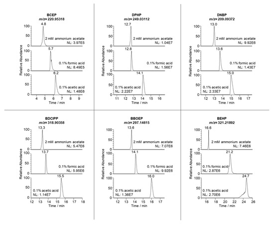 As can be seen in Figure 1, the chromatogram using acetic acid as a modifier for solvent A resulted in overall broad peaks, especially for BEHP, which showed pronounced peak fronting. The use of formic acid reduced that peak fronting but led to peak tailing, especially for BCEP. Using 2 mM ammonium acetate in water as a mobile phase (pH ~7) greatly reduced peak broadening and, even though it caused slight peak fronting, it yielded a better peak resolution. Therefore, we selected this aqueous phase as optimal for separating the OP diesters. We also modified the gradient elution to reduce the analysis time (finally choosing the gradient described in Section 2.4) and confirmed that the selected HRMS conditions still yielded the highest response possible for all compounds.