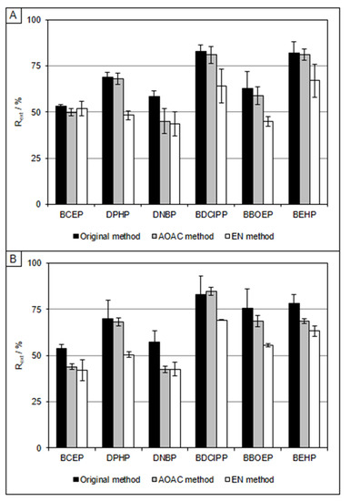Then, instrumental quality parameters and standard calibration curves were calculated for each of the studied compounds taking into account the response of the quantifier ion. Instrumental limits of detection (ILOD) were determined as the concentration at which the response of the quantifier ion was three times the signal-to-noise ratio. The instrumental limits of quantification (ILOQ) corresponded to the lowest concentration of the standard calibration curve. Linear ranges were established for each compound between ILOQ and 1000 µg L−1. The ILOD and ILOQ values ranged from 0.5 to 2.5 µg L−1 and from 1.0 to 5.0 µg L−1, respectively, for all compounds except for BCEP, for which ILOD was 7.5 µg L−1 and ILOQ was 10 µg L−1.