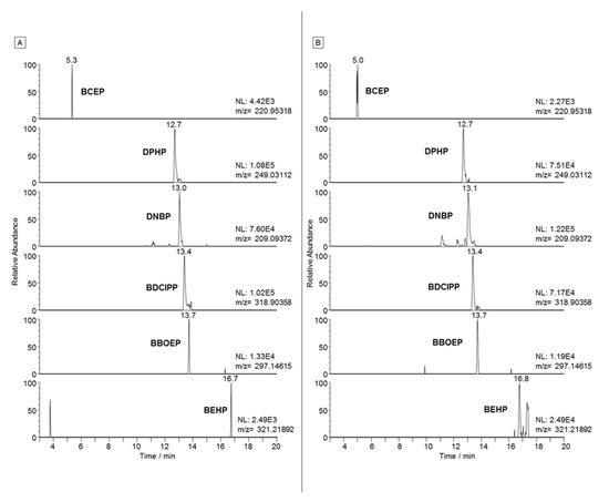 Several in vivo [11,12] and in vitro [13,14] studies report that OP triesters are rapidly hydrolysed by living organisms. OP diesters are some of the most commonly detected metabolites and could be used as biomarkers of exposure to these contaminants. Moreover, some OP diesters, such as dibutyl phosphate (DNBP), bis(2-ethylhexyl) phosphate (BEHP) and diphenyl phosphate (DPHP), are also used as chemical additives in several industrial processes. Therefore, industrial waste is another source of environmental contamination for these compounds [15].