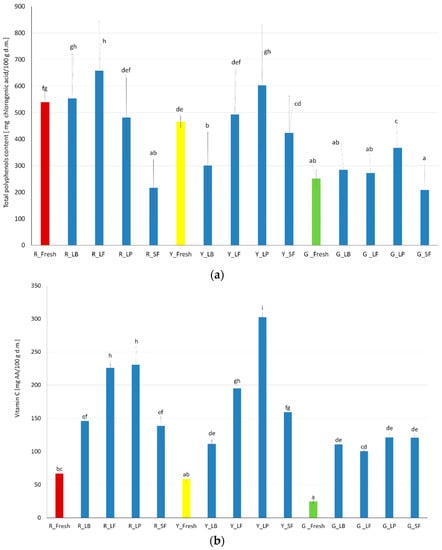 - Hallmann, E.; Marszałek, K.; Lipowski, J.; Jasińska, U.; Kazimierczak, R.; Średnicka-Tober, D.; Rembiałkowska, E. Polyphenols and carotenoids in pickled bell pepper from organic and conventional production. Food Chem. 2019, 278, 254–260. [Google Scholar] [CrossRef] [PubMed]