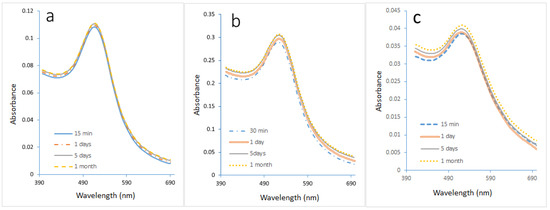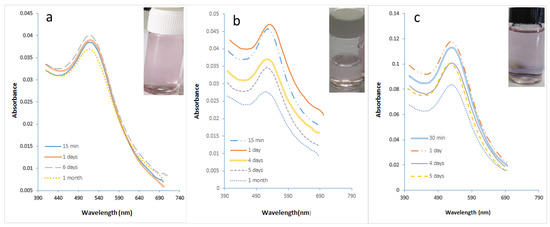 The UV-spectra of GNP samples prepared under optimal conditions in Microreactor mode. (a) in the presence of PVA stabilizer. (b) in the absence of the stabilizer. (c) In the absence of stabilizer and using the batch method.