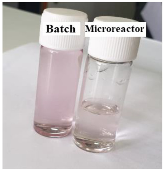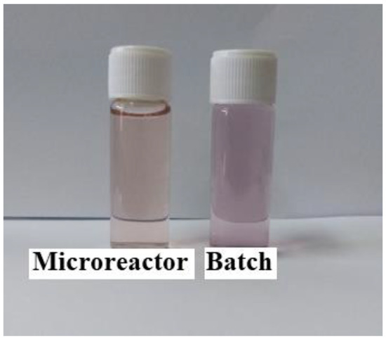 The size of GNPs is determined based on the UV chart. It was also observed how effective the microreactor was in obtaining small-sized GNPs compared to the batch (conventional) method, where GNPs with sizes ranging from 17.4 to 23.6 nm were obtained using the batch method. This was evident in the different colors of the solutions, as seen in Figure 2. In this study, the stock-gold solution mixed with SC solution was loaded into the first syringe and pumped at a rate of 5.55 × 10−6 L/s, while the SB solution in the other syringe was pumped at a high rate of 1.11 × 10−5 L/s. The flow rate of SB was greater than that of gold in order to ensure the saturation process, which helps the fast growth of gold nuclei. Furthermore, it proved to be the most effective method by using a high reactant flow rate to prevent the adhesion process due to decreasing the residence time in the reactor and increasing the mixing process. The residence time was calculated by this equation Ʈ = V/V°, where the volume of the microreactor was 92 µL, and the total flow rate was equal to 1.66 × 10−5 L/s. The residence time inside the microreactor was 5.52 s.