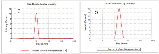 A DLS analysis was performed to verify UV-vis spectroscopy data about the effect of the best conditions on the size and size distribution of GNPs, as shown in Figure 3a,b. The figures show that the DLS size decreased when the GNP synthesis was performed in microreactor mode. The mean size of GNPs in this sample was 11.3 nm, whereas the mean size of GNPs in the batch mode sample was 25 nm. These DLS results are very close to the UV-Vis of this work, in which large GNPs were produced in batch mode, as shown in Figure 1a–c.
