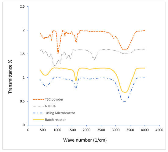 The FTIR spectra of GNPs prepared at various methods. (After 24 h, for batch and microreactor methods, T = 308.15 K, cons of SC, SB, HAuCl4 = 0.1 mM, 700 rpm, total flowrate of SB and gold with SC = 1.66 × 10−5 L/s, Volumetric ratio of SB/HAuCl4 = 4:10, pHi = 3).