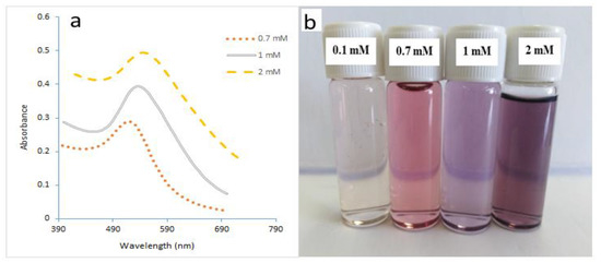 (a) UV spectra of GNPs samples prepared in a microreactor at various gold concentrations. (b) GNPs’ colors (Temperature = 308.15 K, total flowrate of SB and gold with SC = 1.66 × 10−5 L/s, Volumetric ratio of SB/HAuCl4 = 4:10, pHi = 3).