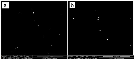 The SEM image displayed in Figure 6 and Figure 7a verified that the pale pink solution contained gold nanoparticles with a spherical ultra-small size of 10 nm. The second image in Figure 6 and Figure 7b shows a gold nanoparticle with a large size with an increasing concentration of gold nanoparticles. It can be seen that the higher concentration of HAuCl4 leads to bigger particles and more agglomeration. This was accompanied by an increase in size when using high concentrations of HAuCl4, which is why agglomerates formed in a shorter time when compared to lower concentrations. These results are consistent with the UV-vis results presented in the previous section of this study