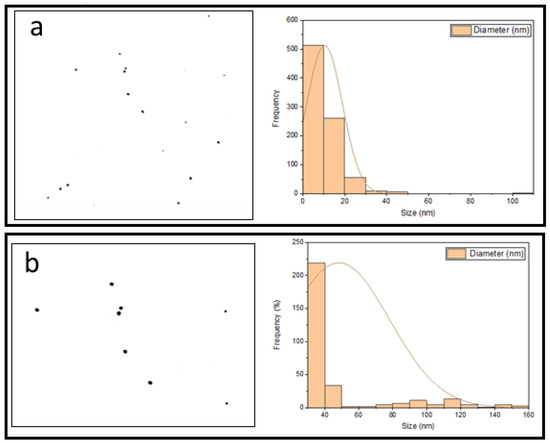 The frequency plot of GNPs prepared under optimal conditions in the presence of the stabilizer PVA. (a) using a microreactor, and (b) using a batch method (T = 308.15 K, total flowrate of SB and gold with SC = 1.66 × 10−5 L/s, volumetric ratio of SB/HAuCl4 = 4:10, pHi = 3, and concentration of HAuCl4, SC, and SB = 0.1 mM).