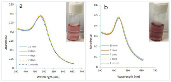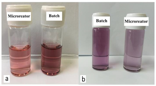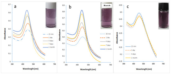 Figure 8a,b show that highly stable GNPs were produced despite the high initial value of gold precursors of 0.7 mM. It was observed that GNPs prepared using the microreactor have a constant wavelength of 521 nm due to the use of a stabilizer. As to Figure 8b, it was noted that GNPs started with a slow growth process with a constant wavelength of 524 nm. The sizes of the GNPs prepared using a microreactor ranged in the presence of PVA from 15.8 to 18.2 nm, while the sizes of the GNPs prepared using a batch ranged in the presence of PVA from 20.5–23.63 nm. The size difference between the two samples was observed through their colors, as seen in Figure 9a.